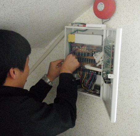 중부소방서 소방관이 투·개표 시 현장 소방시설 정상작동 여부를 확인하고 있다.