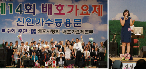 지난 6일 구민회관 3층 대강당에서 개최한 '제14회 배호가요제'에서 수상자들과 내빈들이 기념촬영을(좌), 대상의 영예를 안은 한은주씨가 '첫사랑'을 부르고 있다.(우)