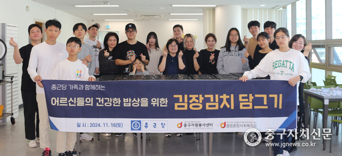 중림종합사회복지관(관장 이해경)은 지난 11월 16일 종근당 홀딩스(대표이사 최희남) 가족봉사단 21명과 복지관 6층 행복나눔식당에서 겨울맞이 김장김치 나눔 행사를 가졌다.
