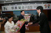 지난달 30일 구청 7층 대강당에서 직원 대표가 구청을 떠나는 정동일 구청장 내외에게 꽃다발을 전달하고 있다. 민선4기 정동일 구청장이 4년간의 임기를 마감하고 지난달 30일 구청 7층 대강당에서 나경원 고승덕 국회의원, 임형주 팝페라 테너 가수, 박노현 중부경찰서장, 공무원, 각 직능단체장, 주민자치위원장과 주민 등 1천여 명이 참석한 가운데 이임식을 가졌다. 이날 참석한 내빈들과 공무원들은 지난 4년간 함께 일한 정 구청장을 떠나보내는 아쉬운 마음을 달래며 박수를 보냈으며, 이경일 중구여성단체연합회장은 송별시인 '비 개인 날에'를 낭송하기도 했다. 이와 함께 정 구청장에게 구청직원을 대신해 윤경숙 행정관리국장이 감사패를, 임종순 전산정보과장이 기념패를, 지해경 민주평통중구협의회장과 김재용 중구상공회장이 감사패를 전달했다. 또한 직원 대표 이우식 김영란씨가 정 구청장 내외에게 꽃다발을 전달하기도 했다. 정 구청장은 "이제 내일이면 구청장 정동일이 아닌 자연인 정동일로 돌아가게 된다"며 "구청장직에 있으면서 매일같이 서너 시간밖에 잠을 이룰 수 없었고 어쩌면 내일 아침도 평상시와 다름없이 동이 트기 전에 잠에서