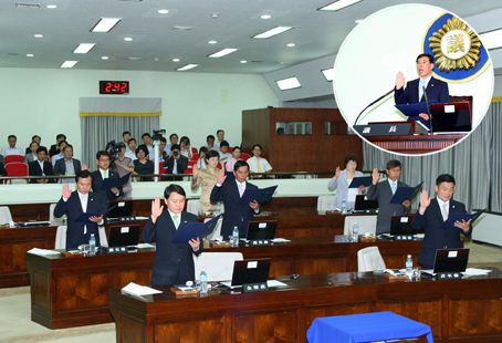 지난 8일 열린 제6대 중구의회 개원식에서 제6대 의원들이 선서를 하고 있다.(우측 상단은 김수안 의장)