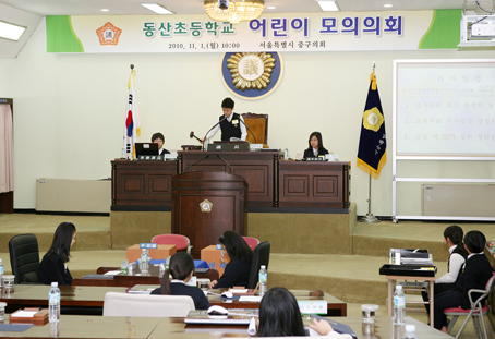 지난 1일 동산초 학생들이 중구의회를 방문해 모의 의회를 열고 의정활동을 체험하고 있다.