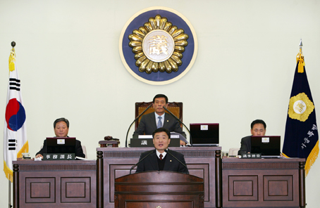 지난달 29일 긴급 소집된 제185회 정례회 제2차 본회의에서 허수덕 의원이 북한의 무력도발에 대한 규탄과 정부의 단호한 대처를 촉구하는 대북 성명서를 낭독하고 있다.