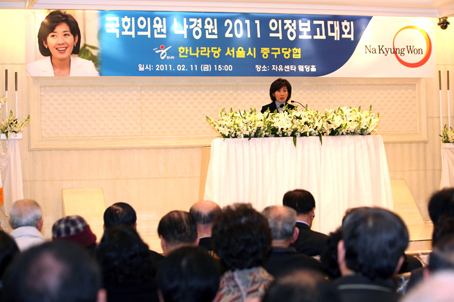 나경원 의원의 세 번째 '2011 의정보고대회'가 지난 11일 남산자유센터 웨딩홀에서 구의원, 당원, 직능단체장, 주민자치위원장, 각 경로당 회장, 남대문 쪽방촌 주민 등 많은 내빈들이 참여한 가운데 황용헌 의원의 사회로 의정활동 내용을 영상으로 소개하면서 시작됐다.