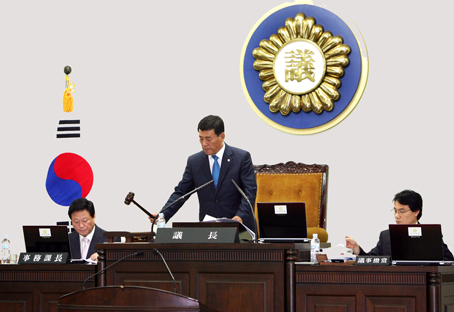 지난달 28일 하루 일정으로 열린 제190회 임시회에서 김수안 의장이 안건을 통과시키고 있다.