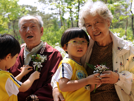 지난 7일 경동어린이집 원생들이 공원장충경로당 할아버지 할머니들에게 카네이션을 달아드리자 기뻐하고 있다.