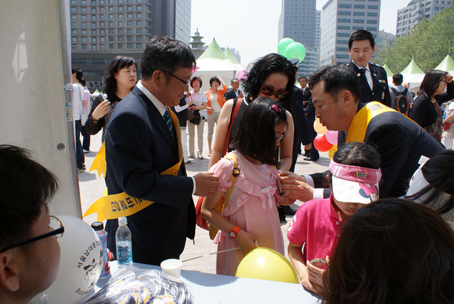 어린이 날인 지난 5일 서울시청 앞 광장에서 남대문 경찰서 청소년 육성회 권오삼 회장과 이철구 서장이 어린이 보호 이름표 달아주고 있다.