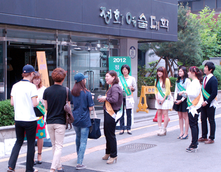 정화예술대학 총학생회 임원들은 등교하는 학생들에게 기념품을 나눠주며 캠페인의 취지를 설명하고 동참을 권유했다.