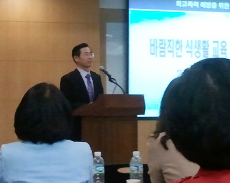 이 교장은 지난 4월 26일 한국농수산식품유통공사(aT)센터에서 식생활교육 국민네트워크에서 주최한 '식생활교육을 통한 학교폭력 예방 모색 심포지엄'에서 '학교 식생활 교육을 통한 사례'를 중심으로 이 같은 주제를 발표한 것으로 뒤늦게 알려졌다.