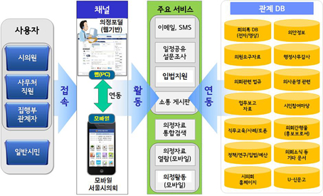 의정포털 시스템은 서울시 의원과 사무처 직원 간 원활한 의사소통을 지원하기 위해 메일, 공지사항, 일정관리, SMS, 설문조사, 입법지원, 상임위 소통방, 집행부 게시판, 의정스케쥴 서비스를 인트라넷으로 제공하고 의원 요구자료, 행정사무감사, 의안, 회의록 등 모든 의정자료를 PC 및 모바일 환경에서 쉽게 검색할 수 있도록 하는 것이다.