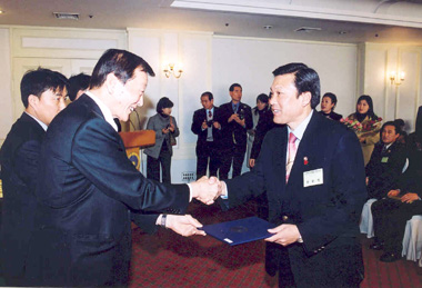 ◇구랍 29일 민주평통 김장환 부의장이 노무현 대통령을 대신해 유공 자문위원인 윤판열 의원에게 표창장을 전수하고 있다.