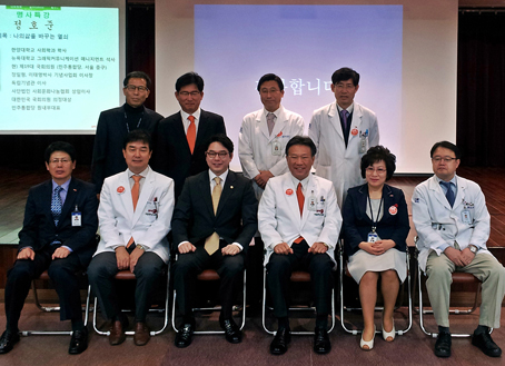 지난 12일 정호준 국회의원(왼쪽에서 3번째)이 국립중앙의료원 직원들을 대상으로 특강을 한 뒤 기념사진을 촬영하고 있다.
