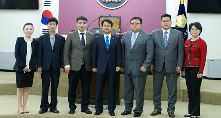 지난 6일 중구의회를 방문한 델거바트 바이양갈구 신임의장과 엘덴 인구개발사회복지구 장관 등이 본회의장에서 박기재 의장등과 기념촬영을 하고 있다.