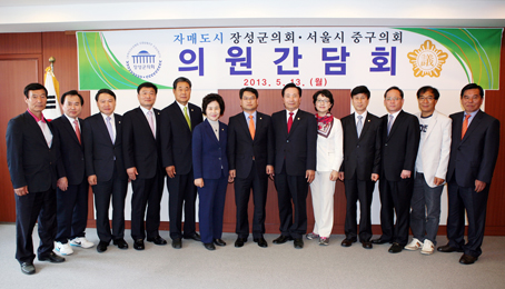 지난 13일 중구의회와 장성군의회 의원들이 의원간담회를 마치고 기념촬영을 하고 있다.