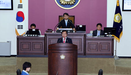 중구의회 소재권 의원이 제206회 제1차 본회의에서 일본 정부의 역사왜곡 망언·망동 규탄 결의문 채택에 앞서 제안 설명을 하고 있다.