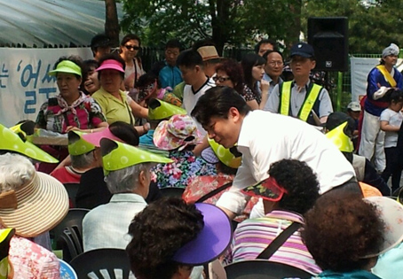 지난 5일 중구 신당동 남산타운아파트를 찾아 국악 한마당 축제에 참석한 정호준 국회의원이 주민들과 인사를 나누고 있다.