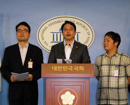 지난 17일 국회에서 정호준 의원들이 기자회견을 열고 국민적 의혹이 철저히 밝혀져야 한다고 밝히고 있다.