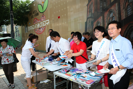 중구의회 이혜경 의원(오른쪽에서 두 번째)은 지난달 26일 명동에서 중구의 자매도시인 속초시의 재경속초시민회(회장 유종국) 회원 20여명이 실시한 '속초사랑 홍보행사'에 참여해 '여름휴가는 속초에서 보내자'는 홍보활동을 전개하고 있다.