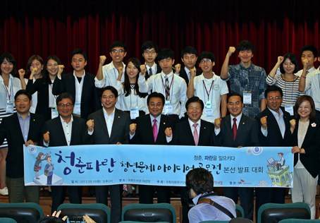 지난 12일 국회도서관 대강당에서 열린 '청춘파란 청년문제 아이디어 공모전'에 참석한 정호준 의원(왼쪽에서 3번째)이 참가자들이 기념촬영을 하고 있다.