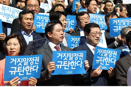 지난달 26일 정호준 국회의원은 국회 본청 앞에서 열린 '공약파기 거짓말 정권 규탄대회'에 참석해 시위를 하고 있다.