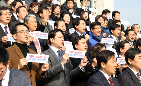 이날 민주당은 새누리당이 기초선거 정당공천 폐지 문제에 대한 결론을 내지 못한 채 국회 정치개혁특위에 일임하기로 한 것을 사실상 공약폐기로 규정하고, 의원총회와 규탄대회를 잇따라 열었다.