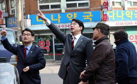 지난 17일 정호준 국회의원이 박기재 중구의회 의장과 함께 신당동에 위치한 약수시장의 상가 사고현장을 방문해 확인하고 있다.