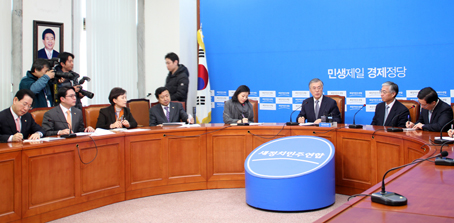지난 13일 정호준 국회의원이 국회 당대표실에서 문재인 대표와 함께 추궈홍(邱國洪) 주한중국 대사와 양국현안을 논의하고 있다.