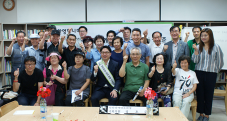 지난달 31일 제2남산타운아파트 일일명예 동대표 회장에 위촉된 정호준 의원이 주민들과 현안문제를 논의한 뒤 기념촬영에서 파이팅을 외치고 있다.