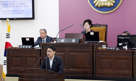 지난달 23일 열린 제225회 중구의회 임시회에서 양찬현 의원이 동화동 공영주차장 박정희 기념공간 연계 반대추진 결의안을 설명하고 있다.