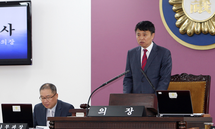지난 23일 열린 제226회 임시회에서 이경일 의장을 대신해 김기래 부의장이 개회사를 하고 있다.