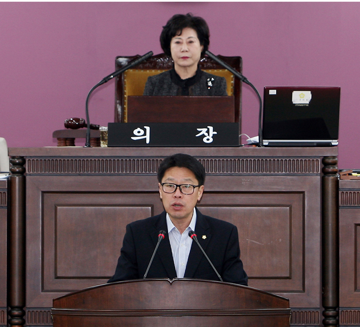 중구의회 양찬현 의원이 국회의원 선거구 획정 반대 결의문에 대한 제안 설명을 하고 있다.