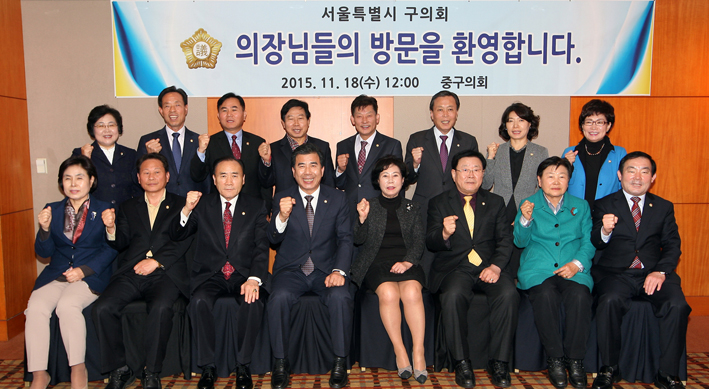 지난 18일 서울시 구의회 의장협의회 월례회의가 앰버서더 호텔에서 열린 뒤 의장들이 파이팅을 외치고 있다.