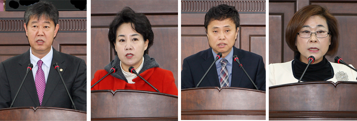 제 227회 정례회서 구정질문을 하고 있는 고문식 의원(왼쪽에서 첫번째), 양은미 의원(왼쪽에서 두번째), 김기래 의원(왼쪽에서 세번째). 이화묵 의원(왼쪽에서 네번째).