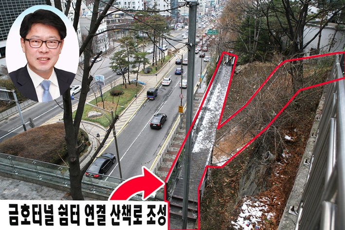 약수동 금호터널 위 쉼터에 구의원과 지역주민들의 노력으로 어르신들이 안전하게 걸을 수 있는 연결 산책로가 조성됐다.