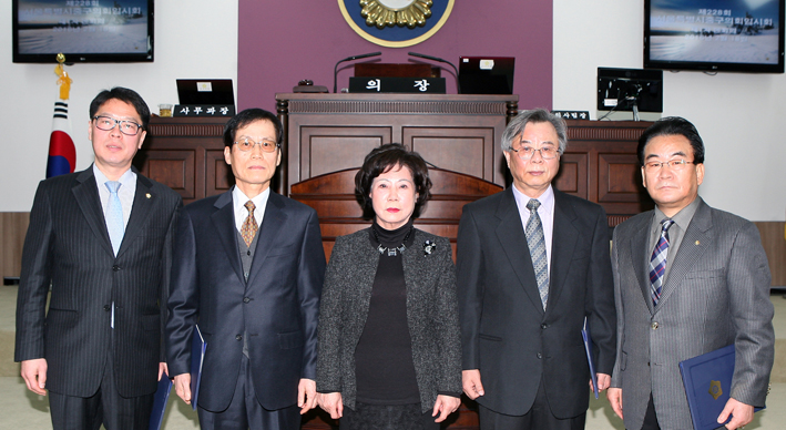 지난 18일 열린 제228회 중구의회 임시회에서 이경일 의장이 결산검사 위원으로 선임된 양찬현 최원익 최승걸 이상환 세무사 등 4명과 본회의장에서 기념촬영을 하고 있다.