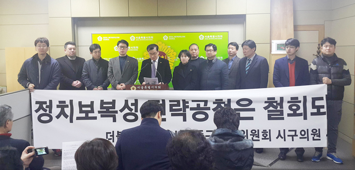 지난 3월 14일 서울시의회 본관 기자실에서 서울시의회 최판술 시의원, 양찬현 변창윤 양은미 의원과 중구지역위원회 당원들은 '중앙당의 중구성동을 전략공천 방침'에 반대하는 기자회견을 열고 성명서를 발표했다.