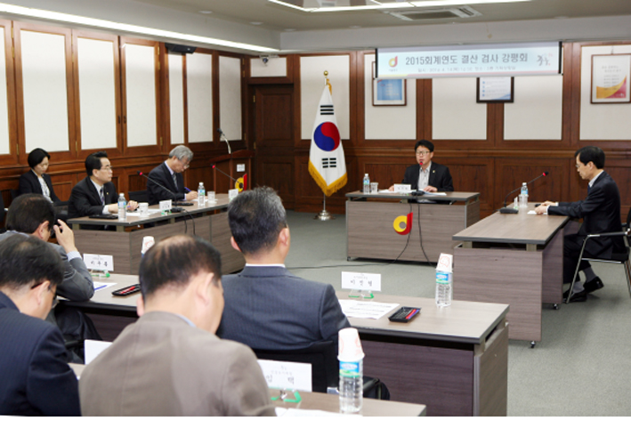 지난 14일 양찬현 책임검사위원이 2015회계연도 세입세출 결산검사 강평에서 인사말을 하고 있다.