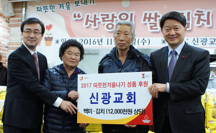 2016년 따뜻한 겨울 보내기 사랑의 쌀·김치 나누기 일환으로 열린 이날 행사에서 백상규 신광교회 담임목사는 "주는 것이 받는 것 보다 복이 있다"는 성경말씀을 봉독하고 서울대학병원에서 15년 동안 일해 온 청소아줌마의 1천만원 불우이웃돕기 성금기탁 사실을 공개하고 나눔의 중요성을 역설했으며, 중구청과 앰배서더호텔에 감사함을 전했다.