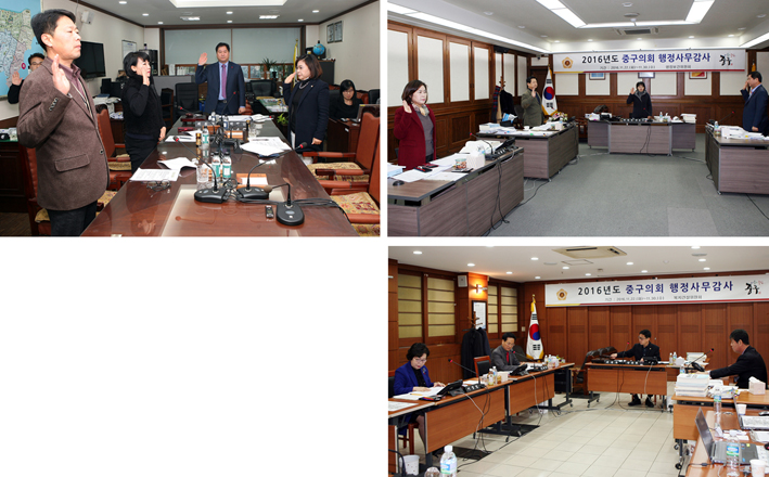 중구의회는 지난 11월 22일부터 30일까지 7일간 집행부(구청)를 대상으로 행정보건위원회와 복지건설위원회가 소관 상임위별로 행정사무감사(이하 행감)를 실시했다. 22일에는 감사담당관, 공보실, 행정관리국, 복지환경국, 23일에는 행정관리국, 복지환경국, 24일에는 기획재정국, 도시관리국, 25일에는 중구문화재단, 중구시설관리공단, 도시관리국, 안전건설국, 28일에는 신당5동, 광희동 주민센터, 안전건설국, 29일에는 보건소, 미진사항 감사, 30일에는 강평과 함께 결과보고서를 작성했다. 의회운영위원회는 지난 11월 30일에는 의회사무과를 대상으로 행감을 실시했다.