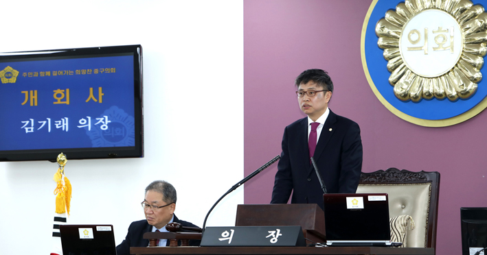 김기래 의장은 개회사를 통해 "지난해 출범한 후반기 제7대 중구의회는 '주민과 함께 걸어가는 희망찬 중구의회'라는 슬로건을 내걸고 힘차게 달려 왔다"며 "2017년에도 구의원 모두는 구민의 삶과 함께하는 의회로 거듭나기 위해 현장 속에서 오로지 민생을 살피고 구민의 삶을 지키겠다."고 밝혔다.