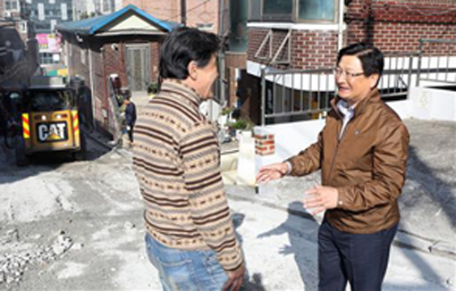 중구의회 변창윤 의원이 신당5동 주택가의 낡은 골목에 대한 포장공사 현장을 확인하고 있다.