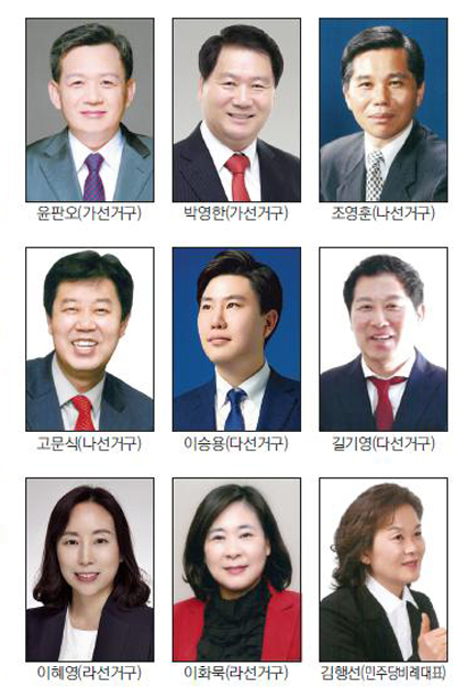 구의원 당선자 중 초선의원은 가선거구 윤판오, 다선거구 이승용, 길기영, 라선거구 이혜영, 비례대표 김행선 후보 등 5명이다. 박영한 이화묵 후보는 각각 재선, 고문식 후보는 3선, 조영훈 후보는 4선 의원이라는 영광을 안게 됐다.