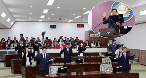 지난 9일 열린 제8대 중구의회 개원식에서 조영훈 의장과 의원들이 선서를 하고 있다