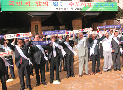 의원들은 의회가 끝난 뒤 중구노인회 임원들과 함께 구민회관 앞에서 "수도이전 서두르다 국가경제 파탄난다"는 어깨띠와 피켓을, "수도이전 결사반대"라는 머리띠를 두르고 "수도이전 중단하고 우리경제 살려내자"등의 구호를 외치며 결의를 다졌다.
