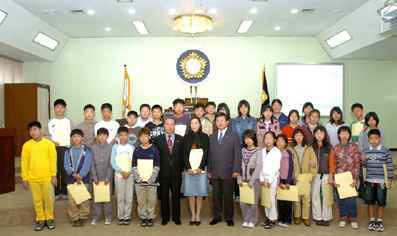 ◇지난 18일 개회된 제116회 중구의회 임시회에 장충초등학교 6학년 학생 35명이 방청객으로 참석했다.(사진은 본회의장에서 김동학 의장과 최병환 행정보건위원장, 학생들이 기념촬영한 모습)