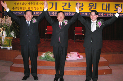 ◇지난 1월 28일 중구구민회관 열린 당원기간대회에서 중구당원협의회장으로 선출된 정선기회장과 정동일 정호준씨가 환호하고 있다.