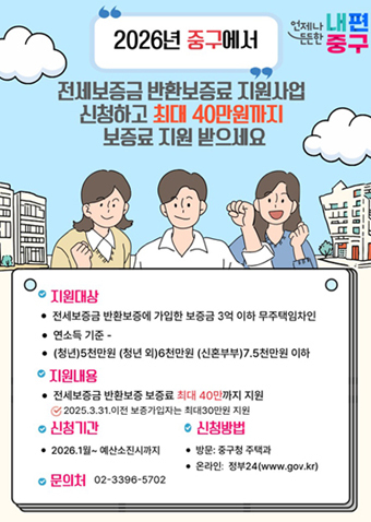 신청은 정부24(www.gov.kr)와 HUG 안심전세포털에서 온라인으로, 또는 중구청 주택과(☎02-3396-5702)로 방문 신청하면 된다. 신청은 연중 수시로 가능하나, 예산 소진 시 조기 마감될 수 있다.