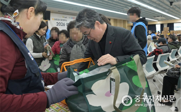 행사장인 중구홀은 ‘설맞이 나눔 마켓’으로 변신했다. 현장을 찾은 400명의 주민은 진열된 다양한 식료품 중 5가지를 자유롭게 골라 담았으며, 떡국 세트와 생필품이 담긴 선물 세트를 추가로 전달받아 풍성함을 더했다.