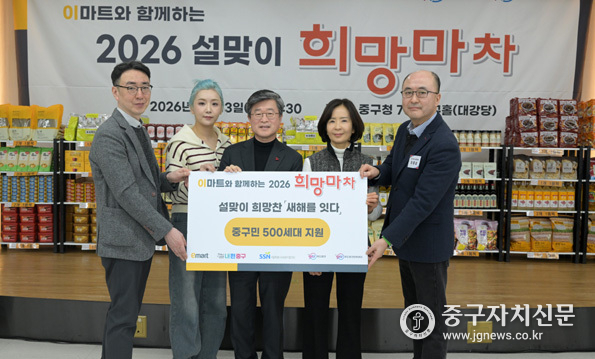 서울 중구(구청장 김길성)는 설 명절을 앞둔 지난 2월 13일 오후, 중구청 중구홀에서 서울잇다푸드뱅크센터, ㈜이마트와 함께 ‘2026 설맞이 희망마차 나눔 축제’를 열었다.