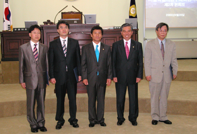 ◇지난 4월 28일 결산검사 위원으로 위촉된 최원익, 이상열, 이동훈 공인회계사와 조영훈 책임위원, 김기태 부의장이 기념촬영을 하고 있다.